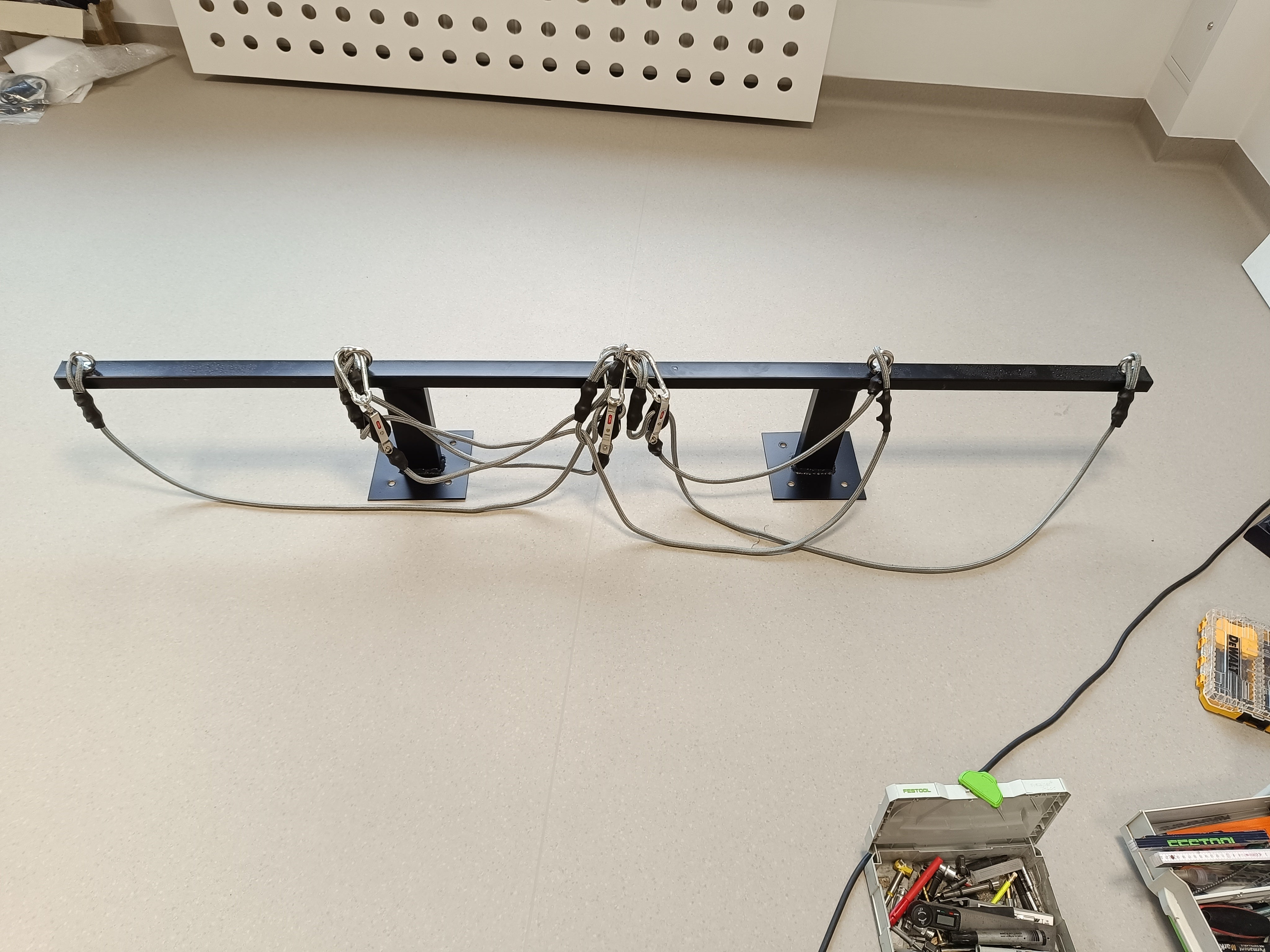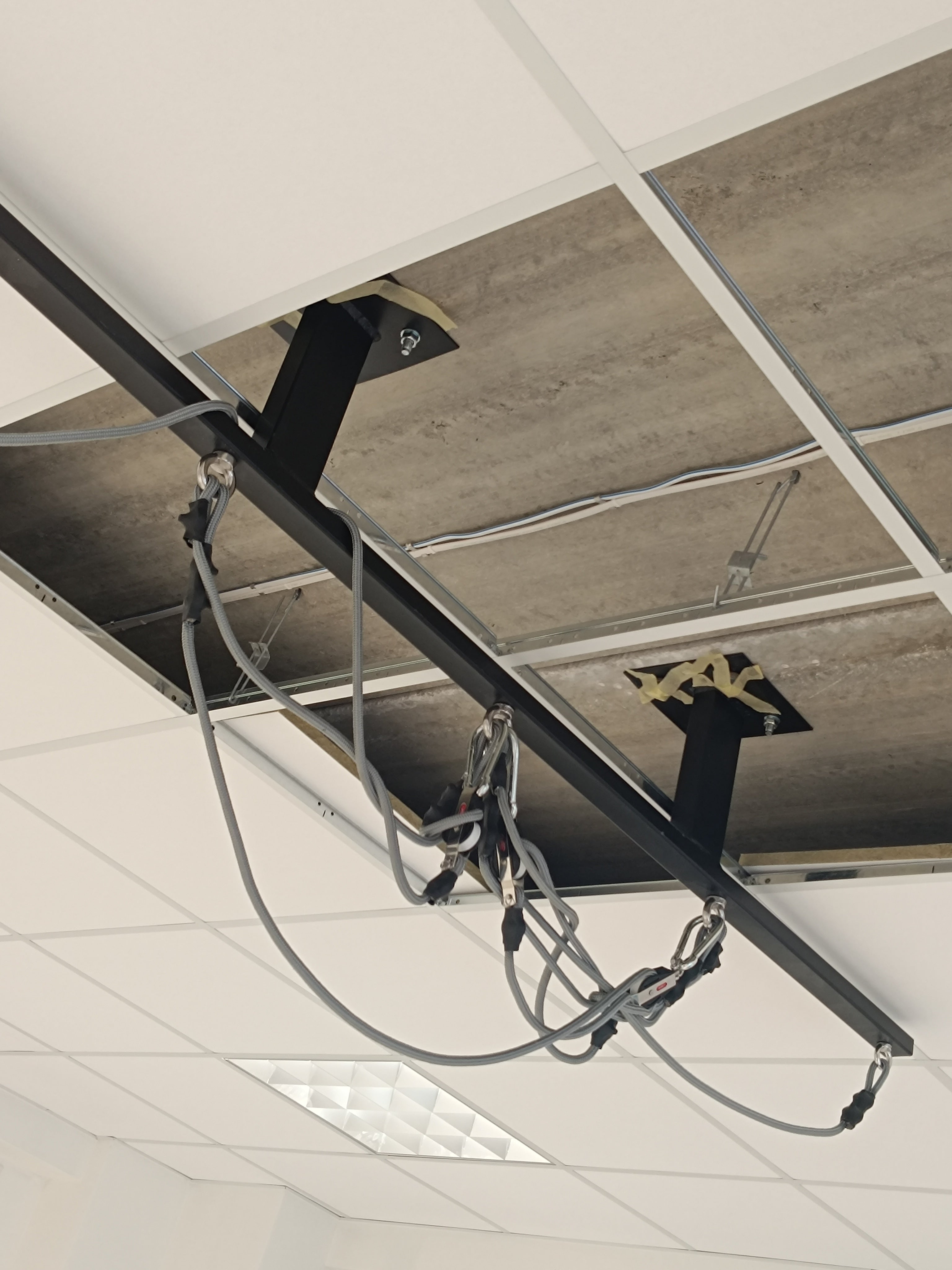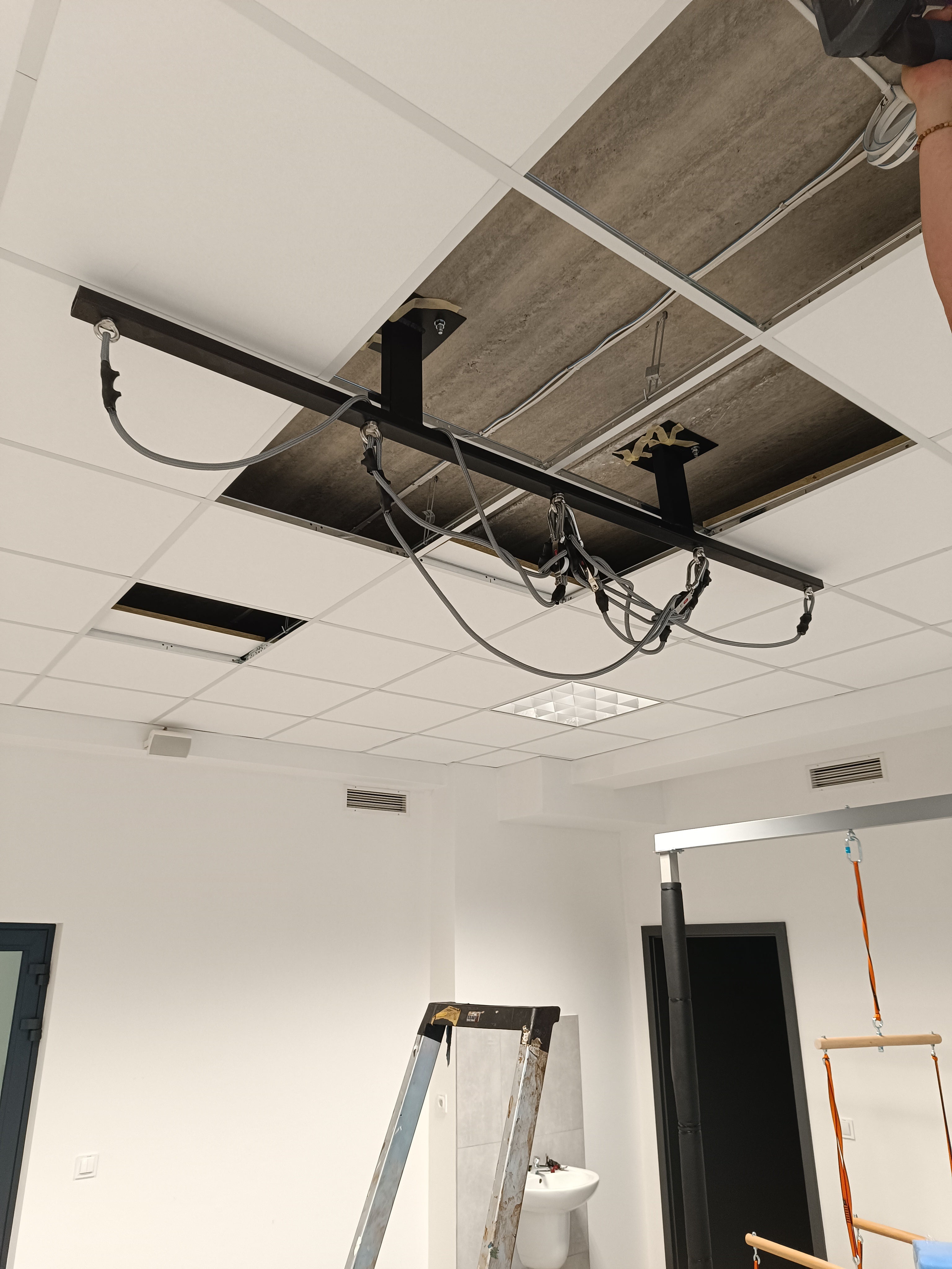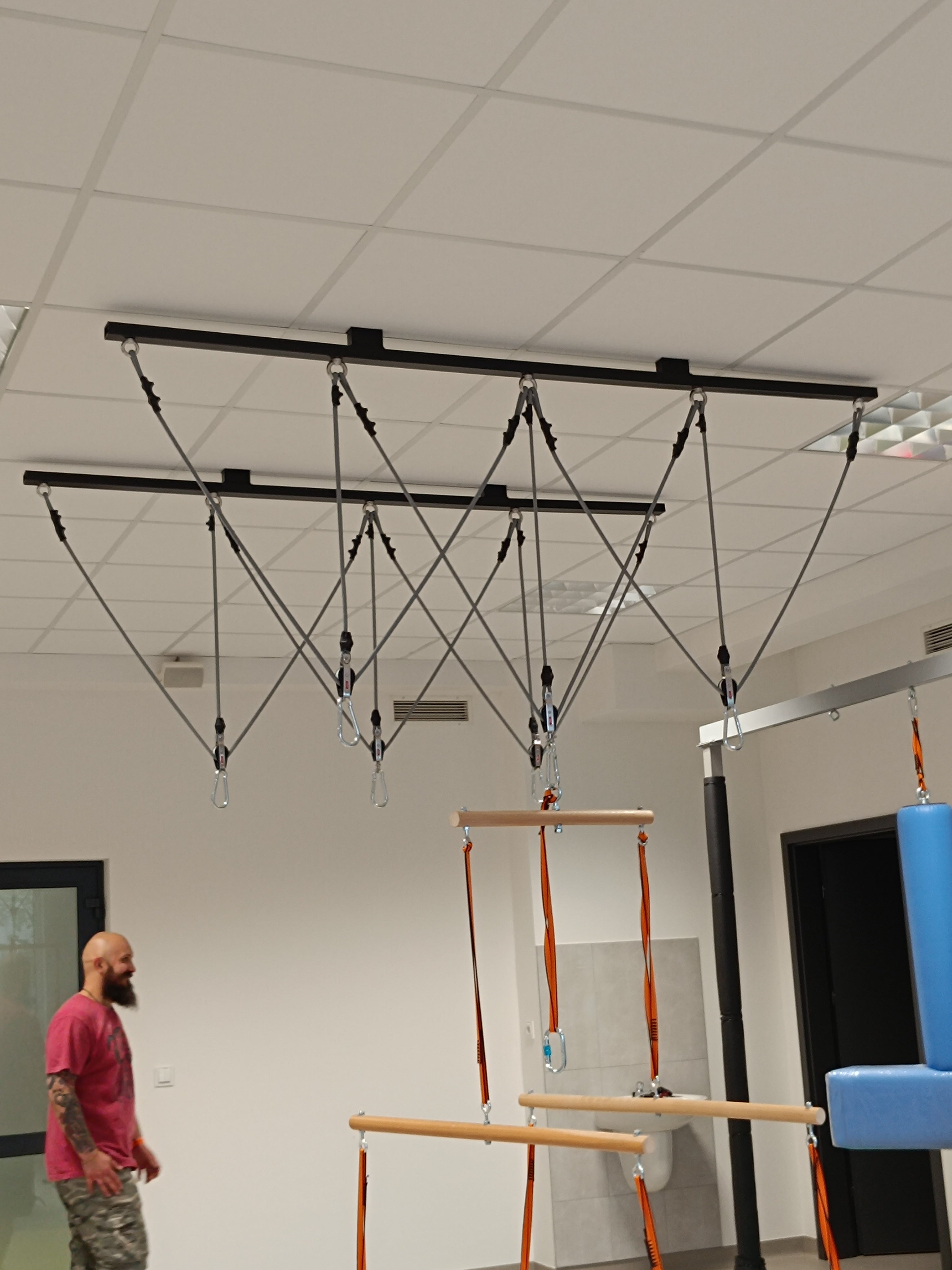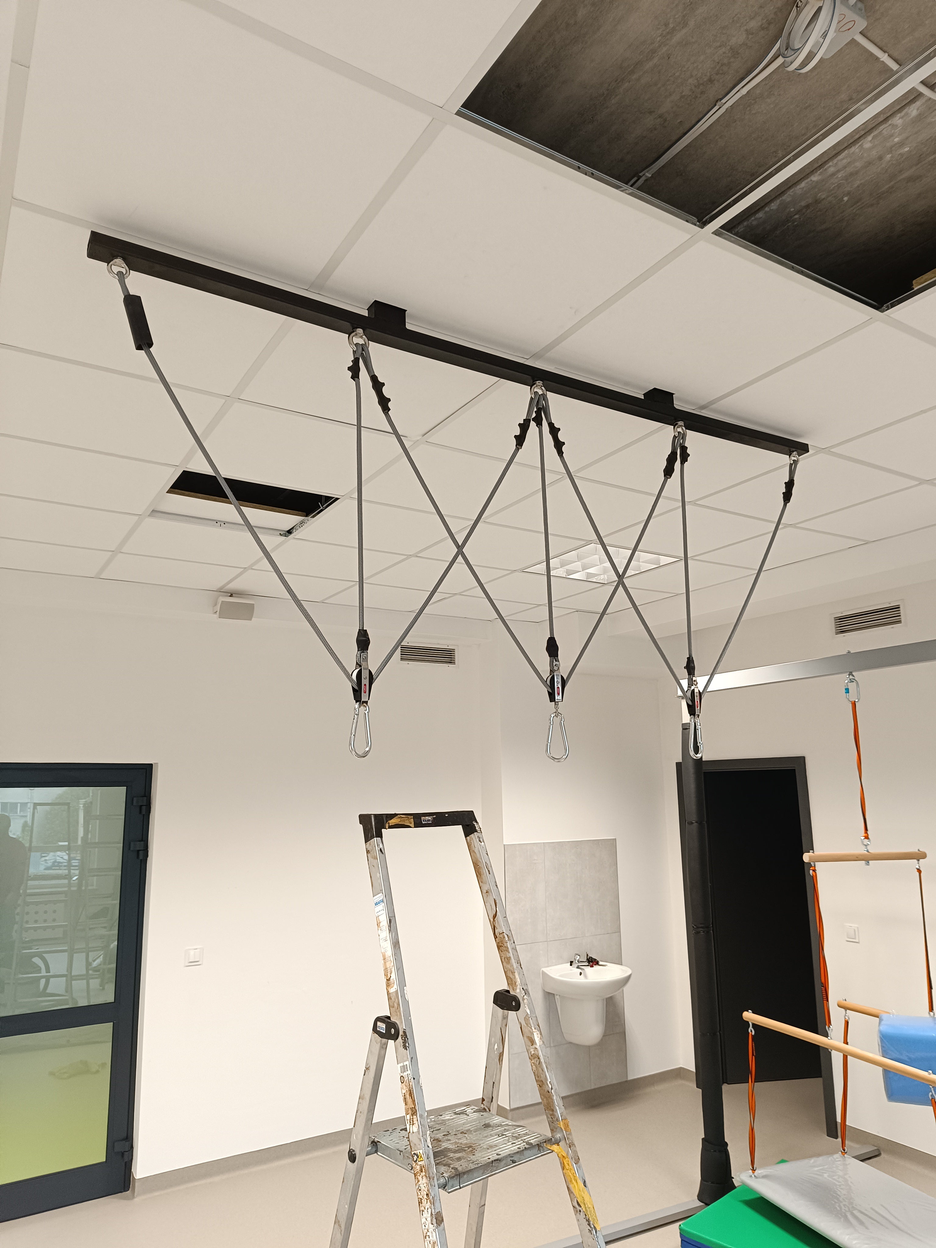 Oferta dotyczy Zawiesia terapeutycznego kompletnego dostosowanego do sufitów podwieszanych. Zawiesie produkowane pod dedykowany strop , wysokość nóg do ustalenia indywidualnego. Listwa długości 200cm. Liny dostosowane do wysokości pomieszczenia. Punkty zaczepu 200cm od ziemi. Konstrukcja malowana proszkowo.